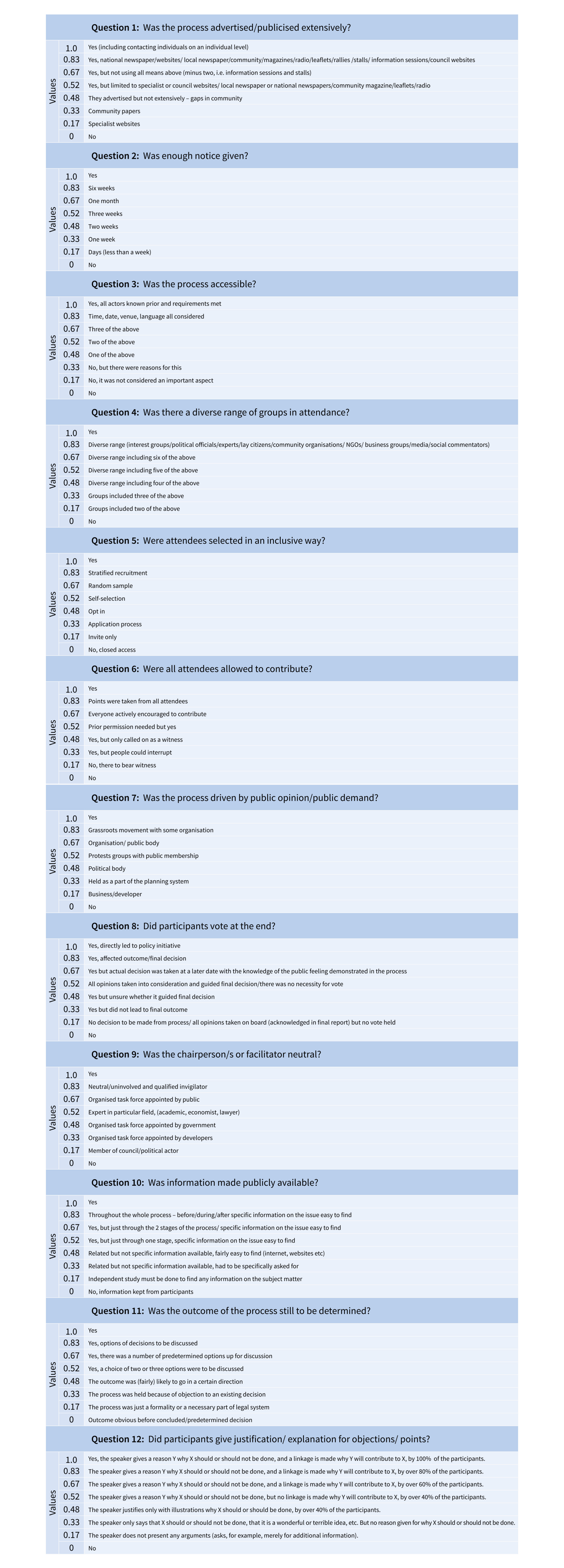 Therefore, crucial for this is that the necessary information is available so that participants can contribute effectively (question 10). Through collective and public debate, a variety of perspectives are highlighted and discussed, measured through the diversity of opinions offered (4 and 6). People are able to effectively reflect on issues when they are exposed to opinions which are not their own. Question 12 seeks to determine how sophisticated the speech acts are and if participants offer justifications for their standpoints (Steiner 2012). The justifications given can be explicit or implicit as long as all participants understand the link between demand and justification(s). For hearings this is vital as it includes lay and official persons and it is probable that some participants will not always understand technical terminology and reasons and justification will help to illustrate the meaning.