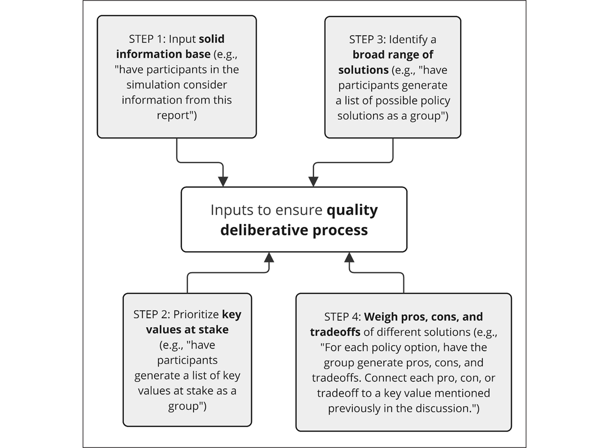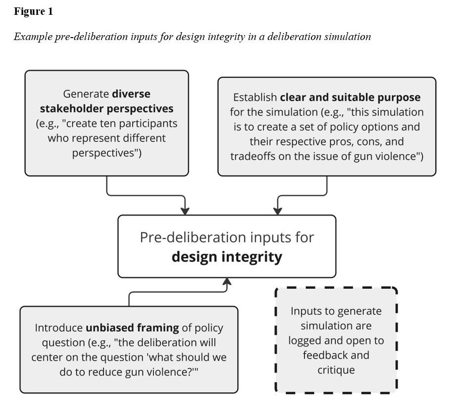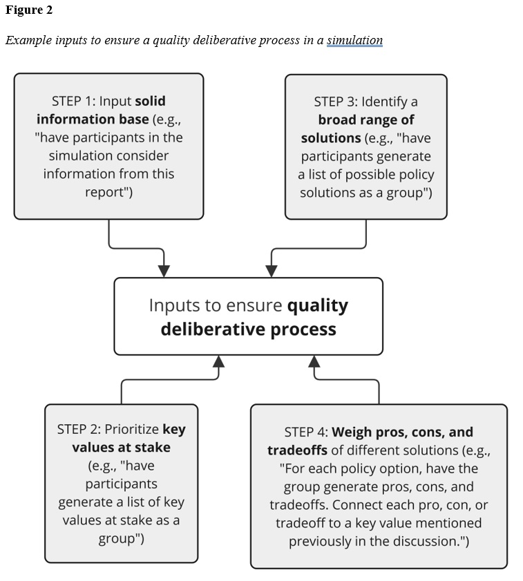 More sophisticated prompt engineering could be used to ensure simulations align with the normative ideals of deliberative democracy. For example, one model would be based on the evaluative criteria for deliberative events and projects proposed by Gastil, Knobloch and Kelly (2012). Their input and throughput criteria, specifically, could be adapted to simulation design. First, the design integrity of a simulation could be modeled through prompts that attempt to provide participant representativeness, unbiased framing, and procedural design involvement (see Figure 1). Then, a simulation could follow their analytic process of deliberation by establishing a solid information base, prioritizing key values at stake, identifying a broad range of solutions, and weighing the pros, cons, and tradeoffs among solutions (see Figure 2; Gastil, Knobloch & Kelly 2012; Gastil & Black 2008). It could end with a report of all the policy options considered by the diverse personas with the accompanying pros, cons, and tradeoffs.