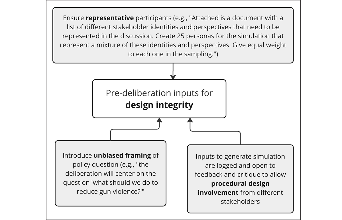 Transparency presents the largest challenge for design integrity and quality control of simulations. Without full disclosure by companies such as OpenAI and Microsoft about the data used to train these models, simulations may always face questions of their legitimacy due to potential biases in their training data. However, this issue mirrors the biases that real people will bring into human deliberation—biases cannot be eliminated, but they can be confronted and mitigated. LLMs such as GPT-4o could be customized and trained by researchers to perform more closely to the ideals of deliberative democracy. This training could include creating an ethical dataset and weighing it more heavily in simulations than the LLM’s base training data, and the model could be iteratively refined based on its performance.