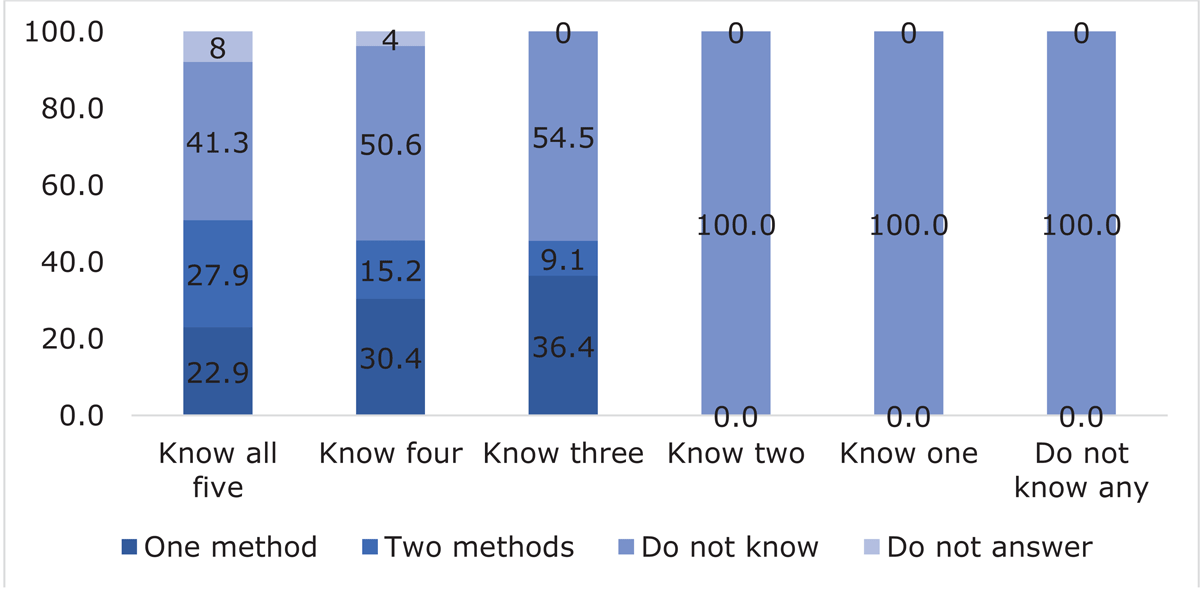 Figure 1 below compares these responses, indicating that elected representatives possess less knowledge than self-reported. For instance, among those claiming to know all five participatory mechanisms (70% of respondents), only half provided one or two examples in the open-ended question. Similarly, among those claiming knowledge of four mechanisms (23%), only 45.6% responded to the open-ended question.