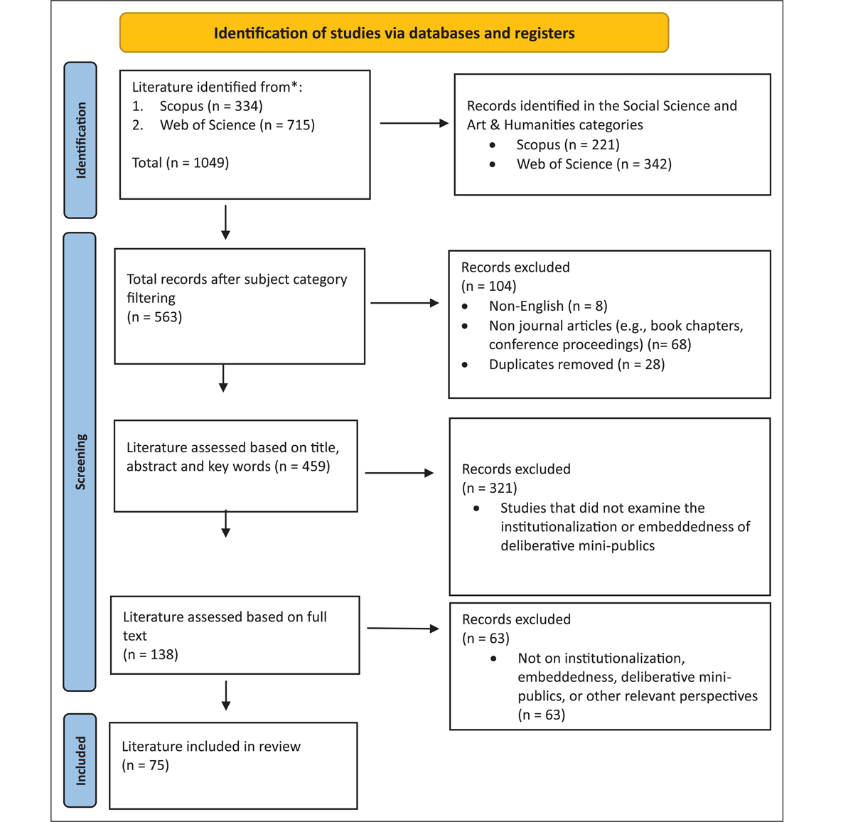 The initial search yielded 563 articles. To ensure comprehensive coverage, we did not impose a publication date range. The last search update was conducted on May 28, 2024. Following common practice, we excluded non-English articles (n = 8), non-journal articles (n = 68), and duplicates (n = 28). We then independently reviewed each remaining article’s title, keyword, and abstract, excluding 321 studies that did not examine institutionalization or embeddedness of DMPs as defined by Boswell et al. (2023): Processes combining random selection and deliberation, including citizens’ assemblies, citizens’ juries, consensus conferences, and deliberative polling. This included studies focusing solely on other participatory methods (citizen science, co-production, co-management, participatory budgeting) without connection to deliberative mini-publics.