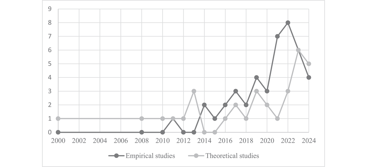 This review covers 32 theoretical and 43 empirical studies. The theoretical studies primarily focused on developing, analyzing, and refining theories rather than analyzing empirical data. Most empirical papers used qualitative methods (74%), followed by quantitative (19%) and mixed-methods (7%): see Table 4.