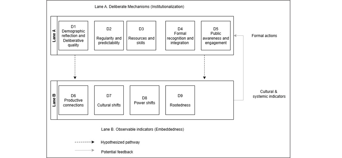 This review makes three theoretical contributions. First, it proposes clear definitions of institutionalization and embeddedness and identifies key dimensions for each, thereby resolving long-standing ambiguities in the mini-publics’ literature and meeting Thompson’s (2008) call for conceptual clarity in the field. Second, the article advances a two-lane analytical framework: five establishment mechanisms (demographic reflection, regularity and predictability, resources and skills, formal recognition and integration, and public awareness and engagement) are paired with four integration indicators (productive connections, cultural shifts, power shifts, and rootedness). Although still untested, the framework offers a heuristic for descriptive mapping and for generating causal hypotheses about how establishment mechanisms might foster integration indicators. Third, the framework hypothesizes a dynamic temporal continuum. While most earlier work selects a single vantage point—formal legislation (Macq & Jacquet, 2023), public scaling (Suiter et al., 2020), culture change (Escobar, 2022), or legitimacy (Devillers et al., 2021)—our model suggests that these perspectives may form successive stages in the same evolutionary process.