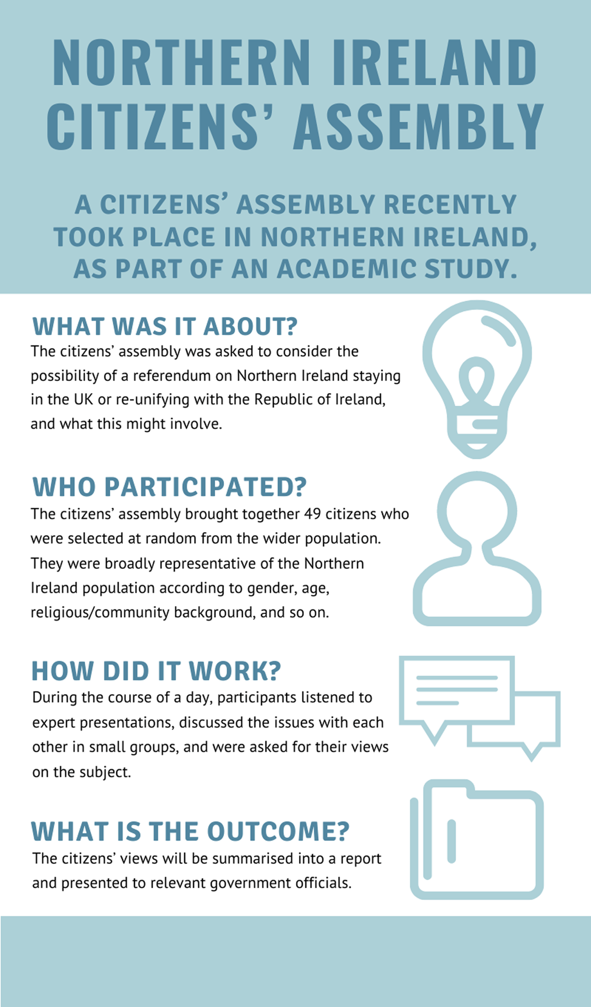 After providing these general views, respondents were then introduced to some brief background material on the minipublic that took place on the topic of Northern Ireland’s constitutional future. For simplicity, the minipublic was described as a ‘citizens’ assembly’.5 To promote engagement, the information outlining the process was summarised in an infographic (Figure 1). The outcome itself was presented to respondents in a graphic form (Figure 2), prefaced with some context:6